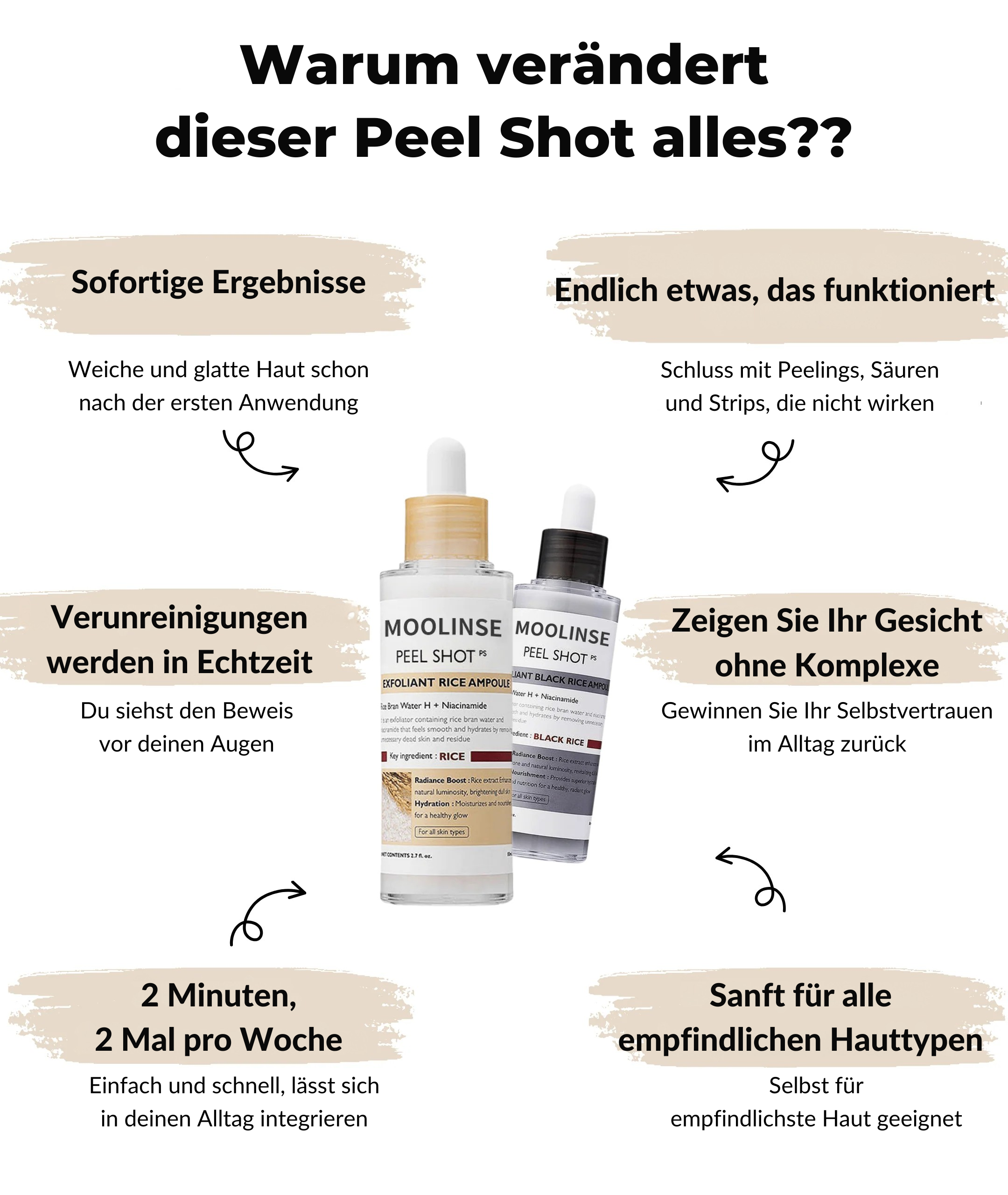 Schon nach der ersten Anwendung: strahlendere und glattere Haut, Make-up hält besser. Keine empfindliche Haut → mehrtägige Anwendung unbedenklich; empfindliche Haut, nicht täglich anwenden. Das „Pilling” sind tatsächlich abgestorbene Hautzellen. Ich habe die Ampulle mit weißem Reis genommen (die schwarze ist ausverkauft). Empfehlenswert.